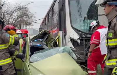 - El vehículo quedó incrustado en la puerta lateral del camión, justo por donde los pasajeros suben.