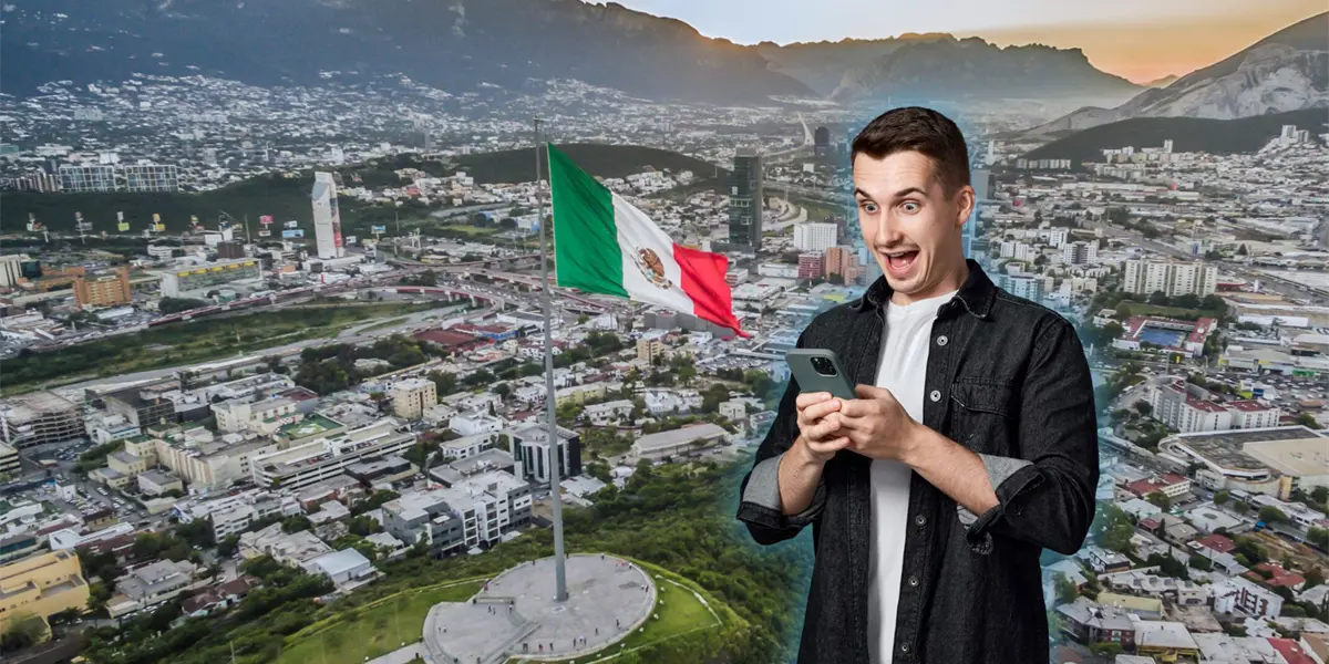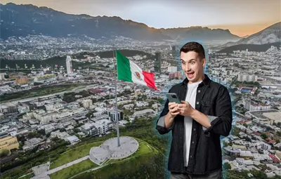 Asta bandera del Obispado y un hombre con celular en mano sorprendido Foto: Canva