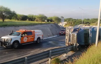 Una volcadura de un camión de quinta rueda se registró este sábado en el Anillo Periférico E 100d, km 66, vía a Tampico Ejido Juárez, Nuevo León, dejando como saldo dos personas lesionadas y afectando el tránsito en la zona.