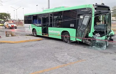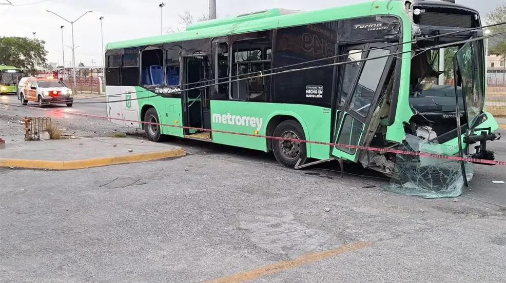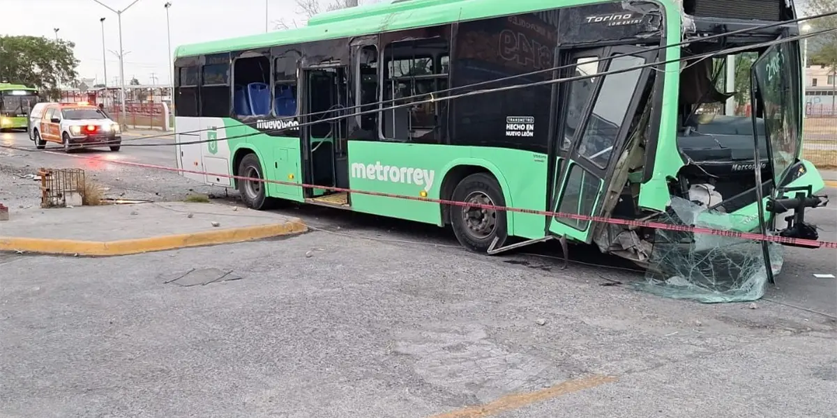 Protección Civil de Nuevo León confirmó que no hubo personas lesionadas tras el choque y que el camión de ruta urbana fue retirado con apoyo de una grúa.