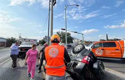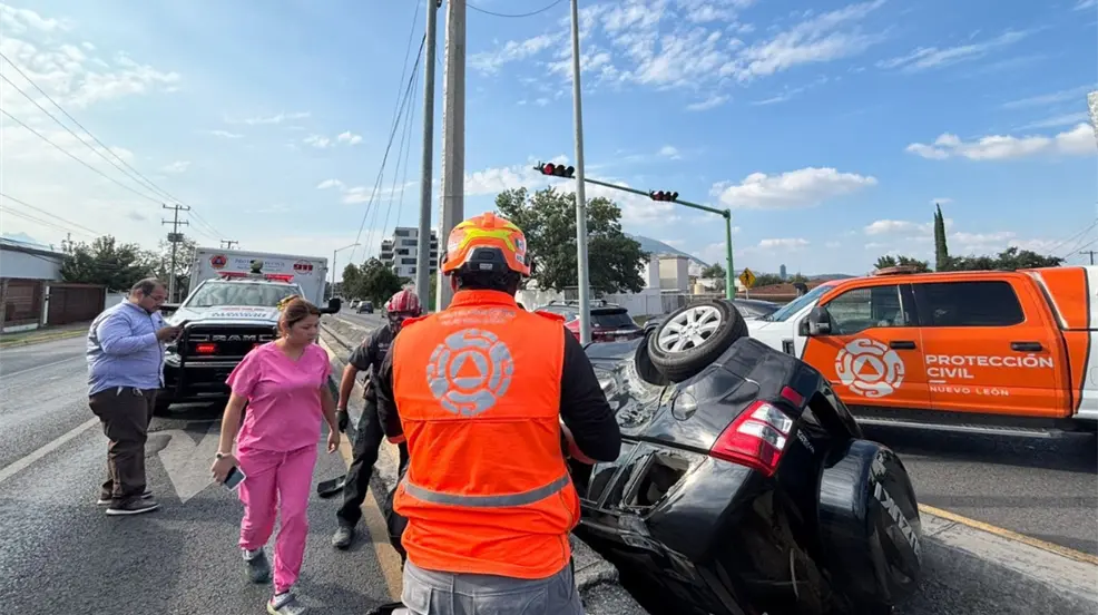 Conductor resultó lesionado tras accidente volcadura camioneta en San Pedro Garza García, reporta Protección Civil Nuevo León.