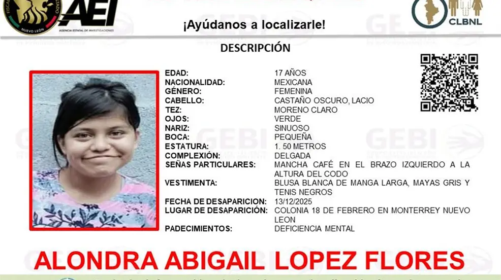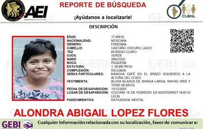 La Fiscalía General de Justicia de Nuevo León emitió un reporte de búsqueda para localizar a Andrea Abigail López Flores, de 17 años de edad, quien desapareció el pasado sábado 13 de diciembre de 2025 en la colonia 18 de Febrero, del municipio de Monterrey.