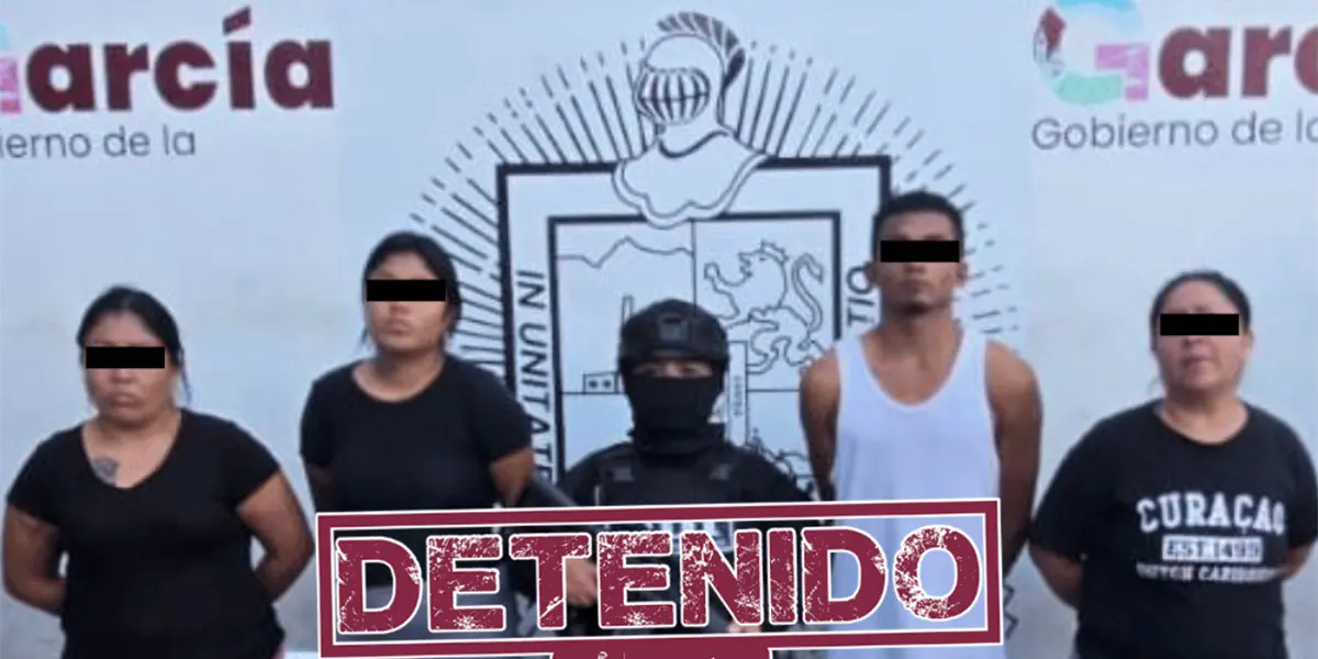 Operativo Escudo García: cuatro detenidos por robo en negocio de telefonía en García, Nuevo León; se hallaron drogas y artículos robados.