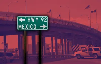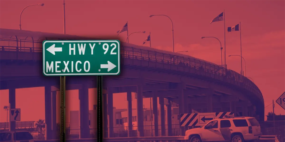 Un letrero y de fondo un puente fronterizo entre Estados Unidos y México. Foto: Canva