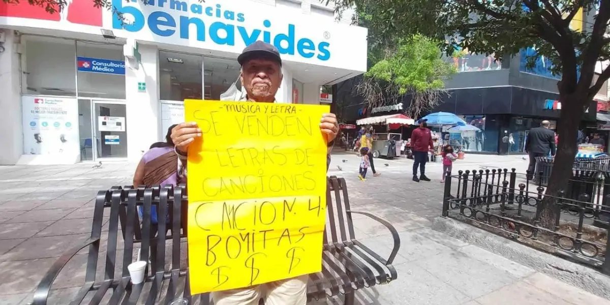 Nuevo León.- Sentado en una pequeña banca de la calle comercial Morelos se encontraba Don Luis, en sus manos un letrero llamaba la atención de quienes caminábamos por el corredor comercial.