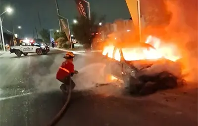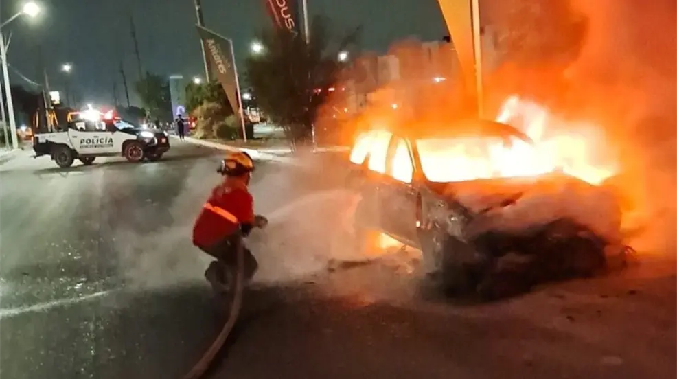 Incendio consume auto en avenida Cerro de la Silla en Salinas Victoria