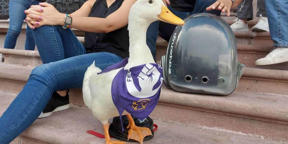 También, aunque parezca extraño una joven llevó a su pato quien aprovechando las actividades organizadas en Palacio de Gobierno, decidió pasear un poco portando un pañuelo morado, en apoyo a la lucha feminista.