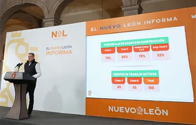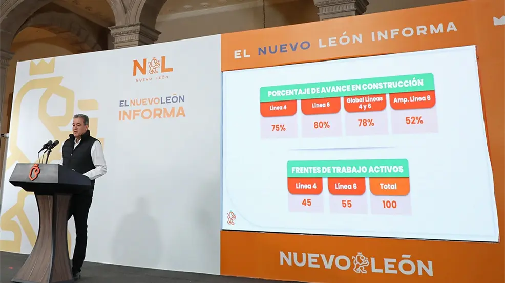 Durante el espacio "Nuevo León Informa", el funcionario destacó que los trabajos en las Líneas 4 y 6 mantienen un paso firme, alcanzando un 78 por ciento de progreso global.