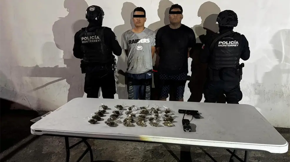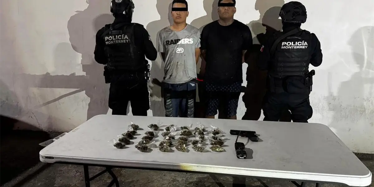 Dos jóvenes fueron detenidos en Monterrey luego de participar en detonaciones con arma de fuego, en un operativo que incluyó persecución y aseguramiento de droga, arma y equipo de comunicación.