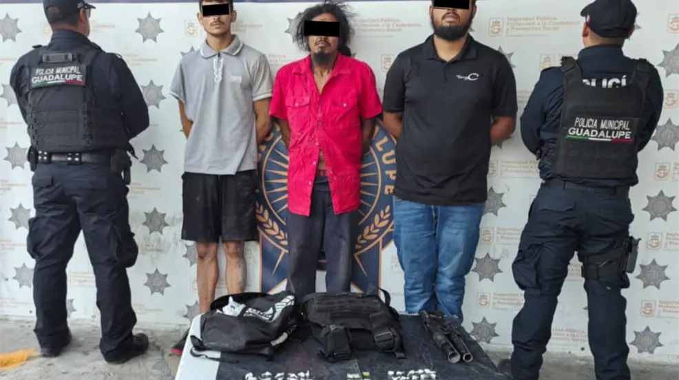 Tres presuntos integrantes de una célula delictiva fueron detenidos por policías de Guadalupe durante un operativo de inteligencia que permitió asegurar un arma larga hechiza, un chaleco balístico táctico y 29 dosis de una sustancia con características similares al cristal.