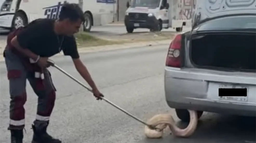 Elementos de Protección Civil de Zuazua acudieron rápidamente al lugar para asegurar a la serpiente sin poner en riesgo a la conductora ni a los habitantes cercanos. Los rescatistas lograron contener al reptil con equipo especializado, evitando que escapara o reaccionara de manera agresiva ante el movimiento del vehículo.