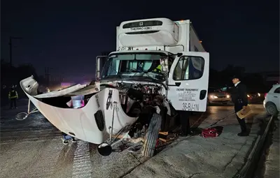 La cabina presentó deformaciones severas, mientras que la caja refrigerada también sufrió afectaciones estructurales.