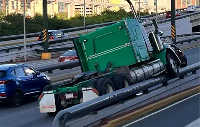 La cabina de un tráiler quedó sobre un camellón y a punto de volcar en plena Avenida Morones Prieto, a la altura del cruce con Pío X, en Monterrey. El incidente generó sorpresa entre automovilistas y afectaciones viales en dirección poniente, cerca del complejo Convex.