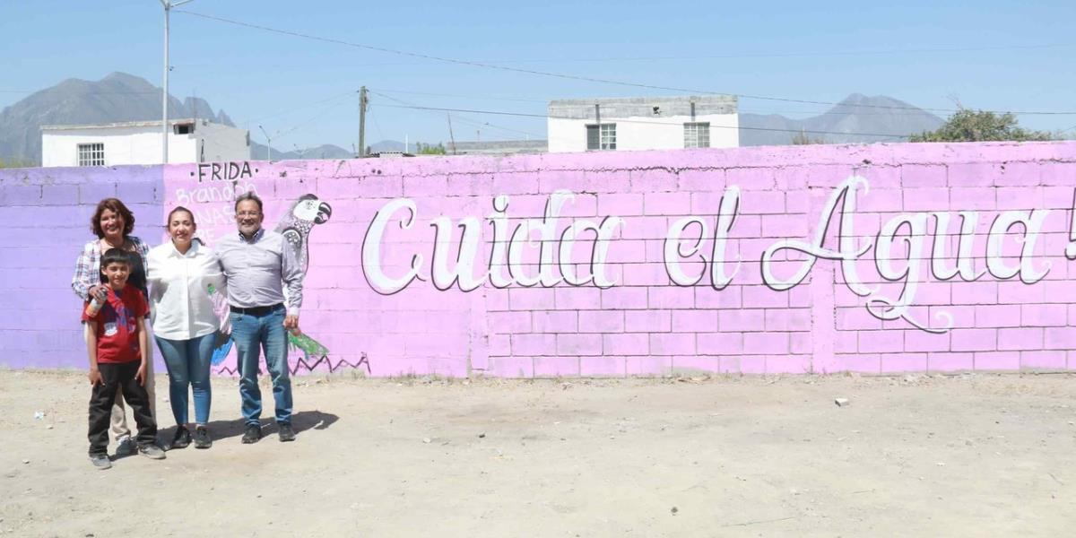 Ante el grave problema que se vive en entidad por la escasez de agua, se pintó un mural con frases sobre el cuidado del medio ambiente y del vital líquido en Escobedo.