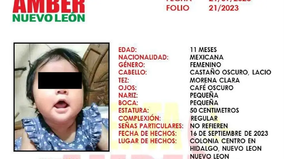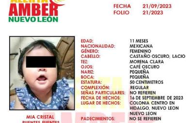 La Fiscalía General de Justicia de Nuevo León activó la Alerta Amber para localizar a la bebita Mia Cristal Puentes Fuentes, de 11 meses, desaparecida en la zona centro de Hidalgo, Nuevo León.