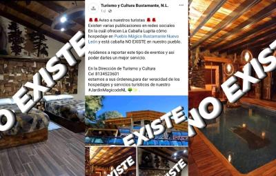 MONTERREY, Nuevo León.- La dirección de Turismo y Cultura de Bustamante solicitó a la población reportar alojamientos falsos que se anuncian en las redes sociales, en este caso La Cabaña Lupita.