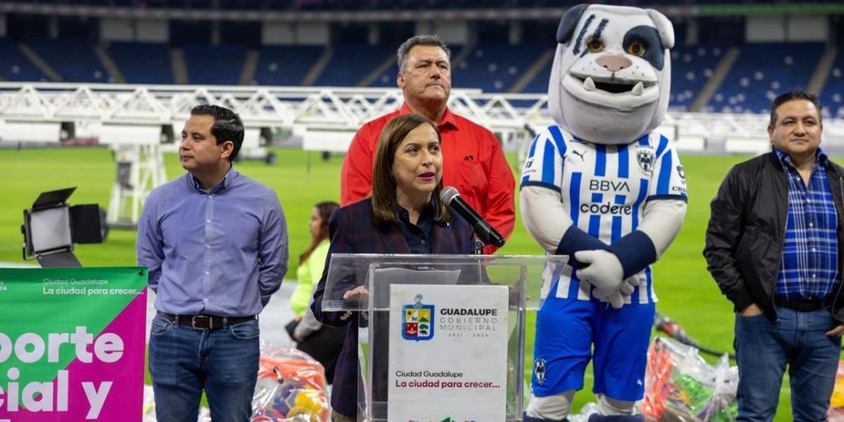 GUADALUPE, Nuevo León.- En un esfuerzo por incentivar la práctica del deporte en niñas, niños y jóvenes de Guadalupe, la Alcaldesa Cristina Díaz hizo entrega de kits deportivos a 90 clubes de fútbol en el Estadio BBVA. Cada equipo recibió un kit que incluía cinco balones de fútbol, diez aros ulas-ulas, dos escaleras pliométricas, diez casacas, cinco vallas y diez conos, con el objetivo de mejorar la calidad de los entrenamientos.