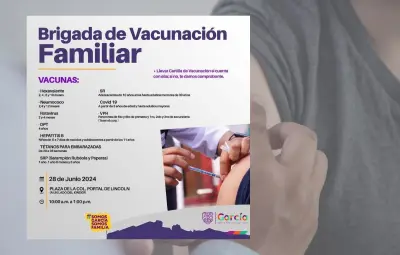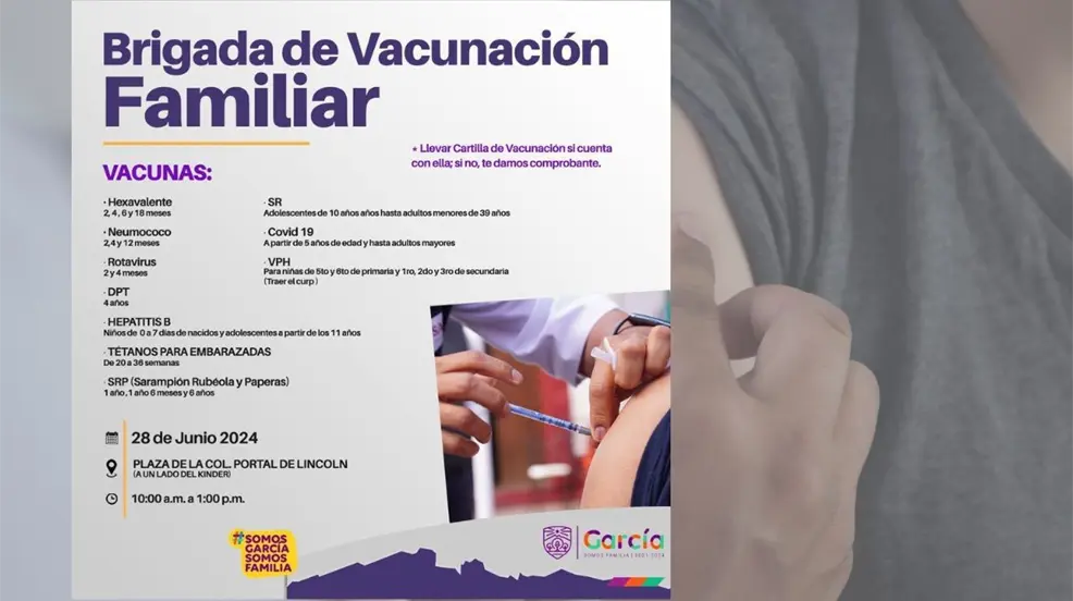GARCÍA, Nuevo León.- El municipio de García invita a sus habitantes para que aprovechen la oportunidad de proteger la salud familiar asistiendo a la Brigada de Vacunación Familiar que se llevará a cabo el viernes 28 de junio en la colonia Portal de Lincoln.