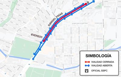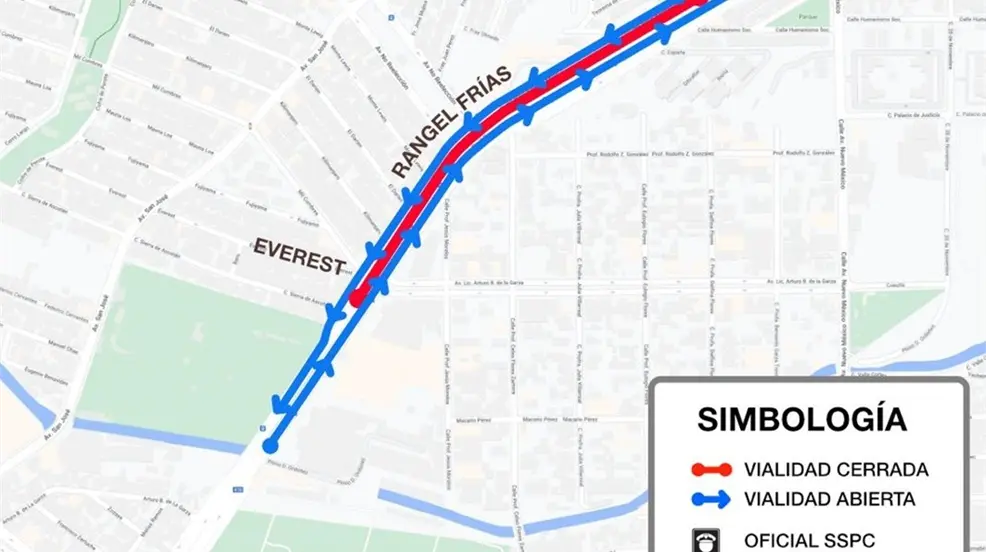 Los cierres iniciarán a las 22:00 horas y concluirán a las 4:00 horas del miércoles. Durante este tiempo, únicamente se permitirá la circulación por los carriles laterales de la avenida, en el tramo comprendido a la altura de la Plaza Rangel Frías hasta la calle Everest.