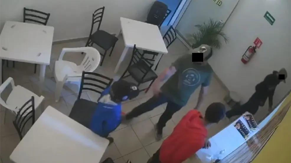 Cámaras de seguridad captaron el delito cometido en el negocio denominado 'Many’s Wings & Snacks', ubicado en la calle Sierra Caliza, de la colonia Lomas de Santa Catarina.