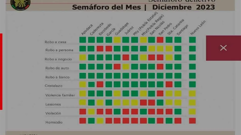 En todos estos aspectos, Cadereyta ha obtenido calificaciones positivas, a excepción de la categoría de violación, que se encuentra en amarillo.