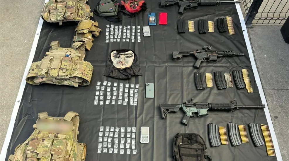 Los presuntos delincuentes fueron detectados abordo de una camioneta en color blanco, en la que transportaban 2 armas largas abastecidas con 50 municiones, cuatro cargadores con 60 cartuchos, 3 chalecos balísticos, 80 dosis de cristal y dos máscaras.