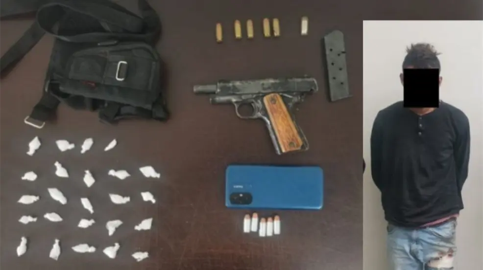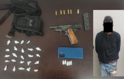 Al solicitarles una revisión precautoria, se le encontró y decomisó un arma corta abastecida con cinco balas y 24 dosis con una sustancia sólida parecida al cristal.