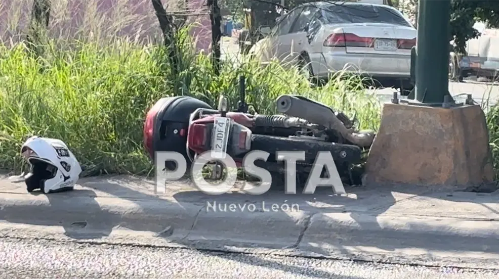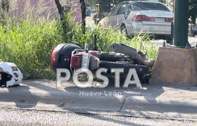 Un frenón sorpresivo y aguas negras provocaron que un motociclista derrapara en la colonia Lázaro Cardenas en Monterrey.