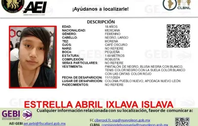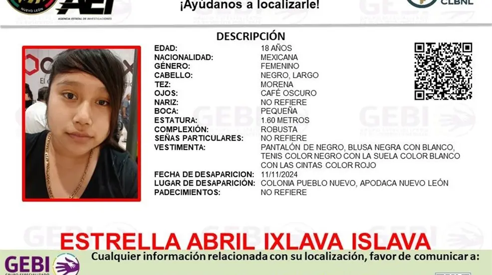 MONTERREY, Nuevo León.- La Fiscalía General de Justicia de Nuevo León emitió un reporte de búsqueda para buscar a la joven Estrella Abril Ixlava Islava, de 18 años de edad, quien desapareció el pasado 11 de noviembre de 2024 en la colonia Pueblo Nuevo, del municipio de Apodaca.