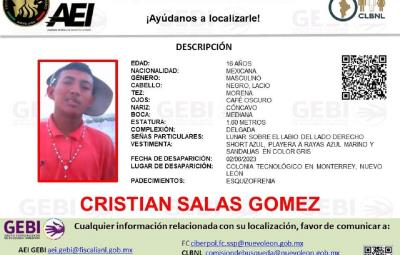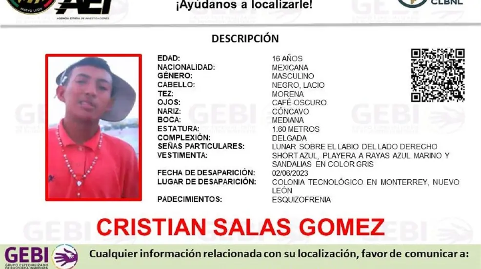 La Fiscalía emitió un reporte de búsqueda para localizar a Cristian Salas Gómez, de 16 años, quien desapareció en la colonia Tecnológico, de Monterrey; sufre de esquizofrenia.