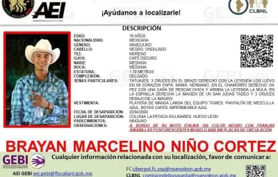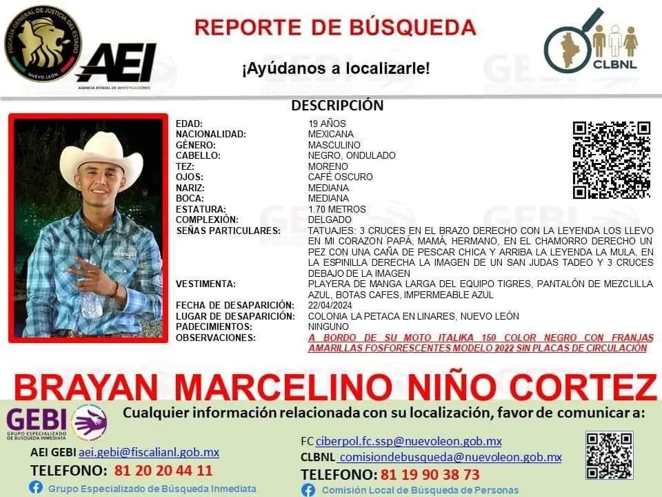 GARCÍA, Nuevo León.- Un joven de 19 años, identificado como Brayan Marcelino Niño Cortez, es buscado por sus familiares después de que desapareciera el pasado 22 de abril en el municipio de Linares.
