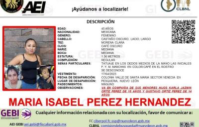Emiten una alerta de búsqueda por una mujer de 46 años que desapareció junto a sus dos hijos de 14 y 15 años respectivamente en el municipio de Pesquería.