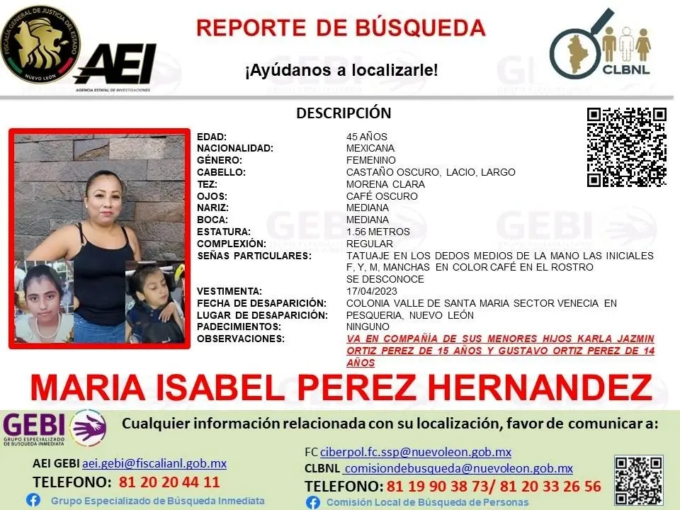PESQUERÍA, Nuevo León.- En medio de la crisis de las desapariciones que se han presentando en los últimos días en Nuevo León, ahora las autoridades emitieron una alerta de búsqueda de por una mujer, de 46 años, que desapareció junto a sus hijos de 14 y 15 años en el municipio de Pesquería.
