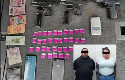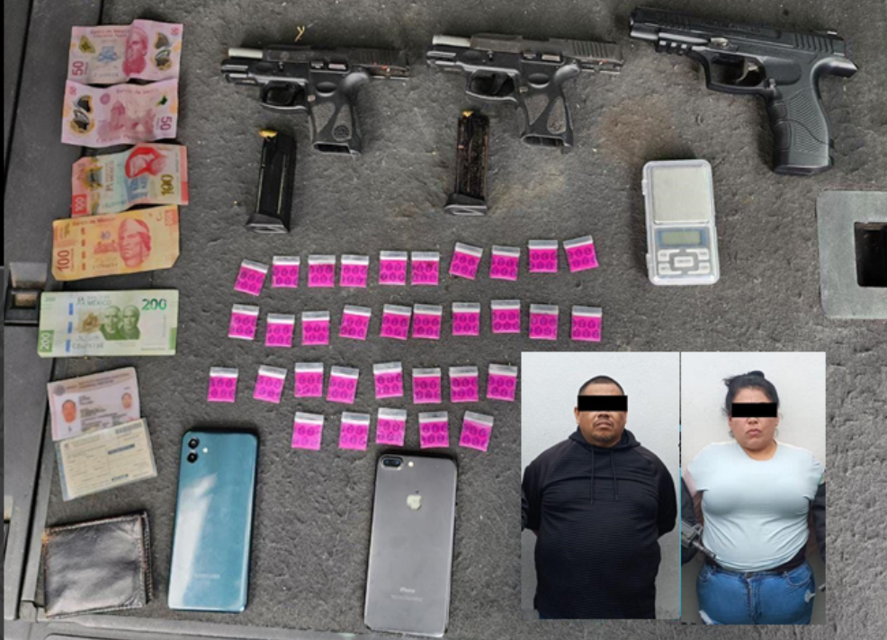 Al momento de su captura se les encontraron más de 30 envoltorios que contenían una sustancia con las características de la cocaína en polvo, dos armas cortas calibre .9 milímetros, un arma de postas, una báscula digital, cuatro celulares, dinero en efectivo y un vehículo Dodge Nitro.