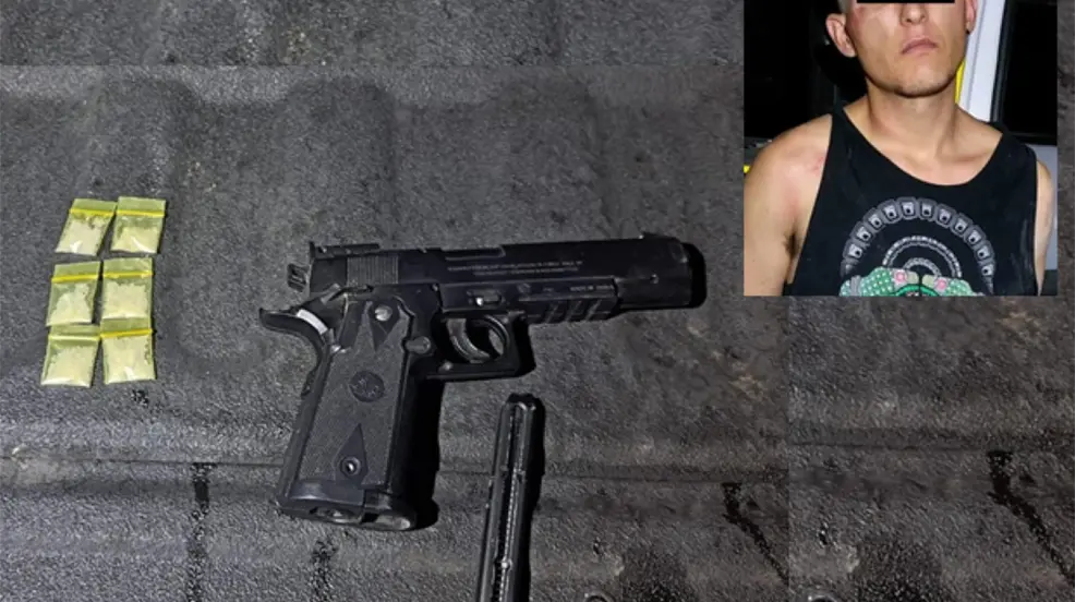 Durante la inspección, se encontraron seis bolsas de plástico tipo ziploc con una sustancia sólida similar a la droga conocida como cristal, así como un arma de fuego tipo escuadra en su cintura.