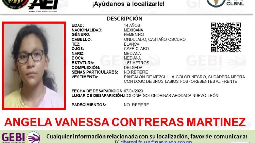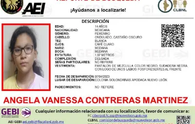 La Fiscalía General de Justicia de Nuevo León emitió un reporte de búsqueda para localizar a Angela Vanessa Contreras Martínez, de 14 años, desaparecida en la colonia Golondrinas, en Apodaca.
