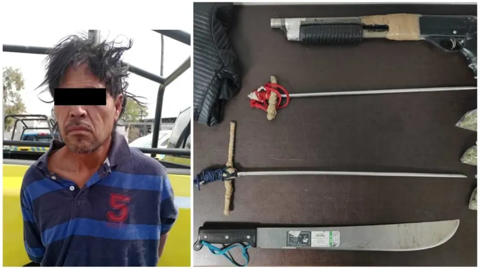 La detención de Mario C., de 53 años de edad, se registró en la citada colonia, donde además el hombre llevaba, droga, una escopeta y dos espadas.
