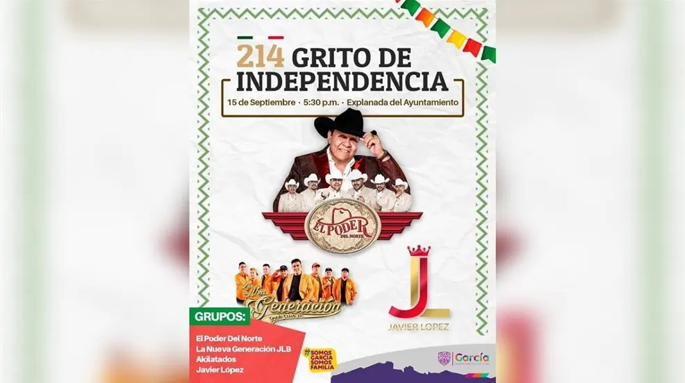 El Gobierno de García invita al Grito de Independencia el 15 de septiembre con música en vivo de El Poder del Norte y más. ¡Un evento familiar imperdible!