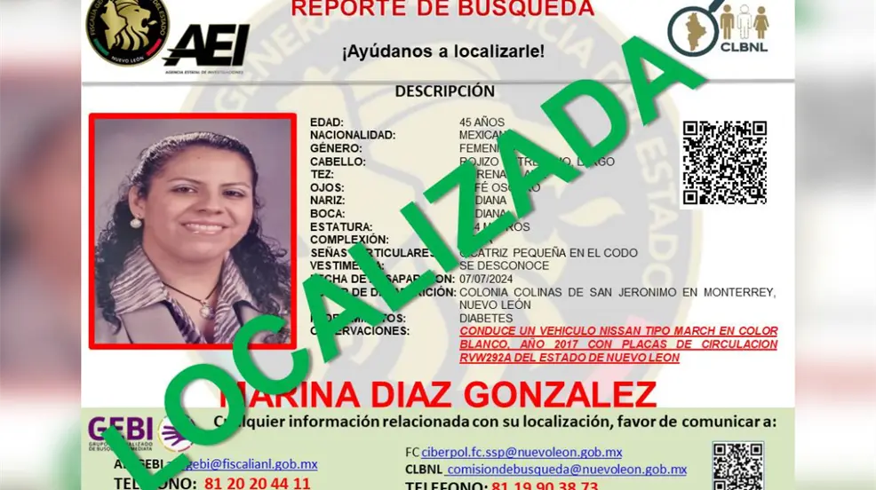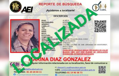 MONTERREY, Nuevo León.- La Agencia Estatal de Investigaciones (AEI), dio a conocer que Marina Díaz González, la maestra de kínder del Instituto Cumbres en Monterrey que estuvo desaparecida durante 15 días, ha sido finalmente localizada con vida.
