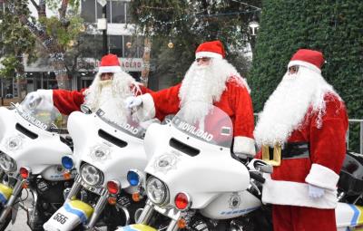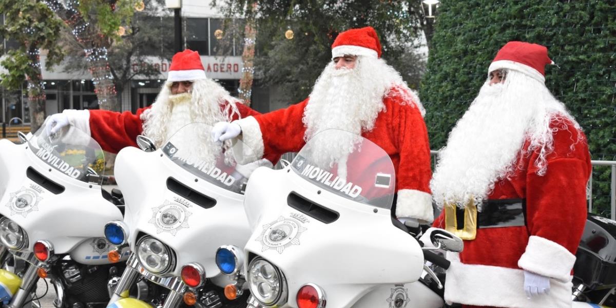 MONTERREY, Nuevo León.- Con el fin de imprimirle un toque navideño a sus labores de seguridad, elementos de la Dirección de Vialidad y Tránsito de Monterrey se vistieron de Santa Claus para recorrer en sus motocicletas las principales avenidas del municipio.