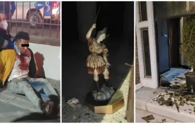 Al aproximarse a la entrada, cuyo barandal estaba cerrado con candado, observaron que el presunto estaba con una lesión en el cuello, misma que al parecer se la causó con una lanza de la estatua.