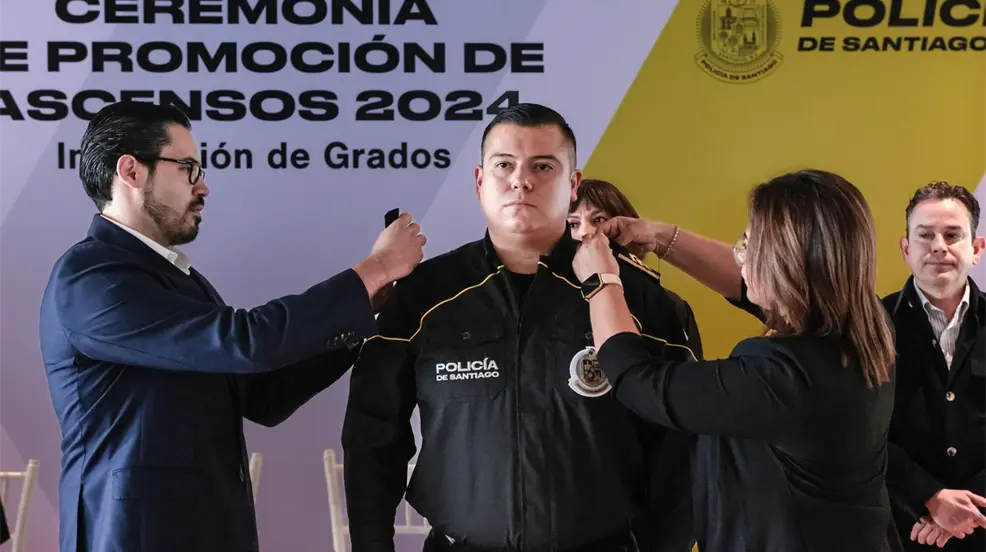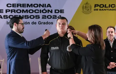 SANTIAGO, Nuevo León.- Por primera vez en el Municipio de Santiago, se llevó a cabo una ceremonia formal para promover a elementos policiales, encabezada por el Presidente Municipal, David de la Peña Marroquín. Este evento histórico marcó un paso significativo hacia el fortalecimiento de la corporación de seguridad.