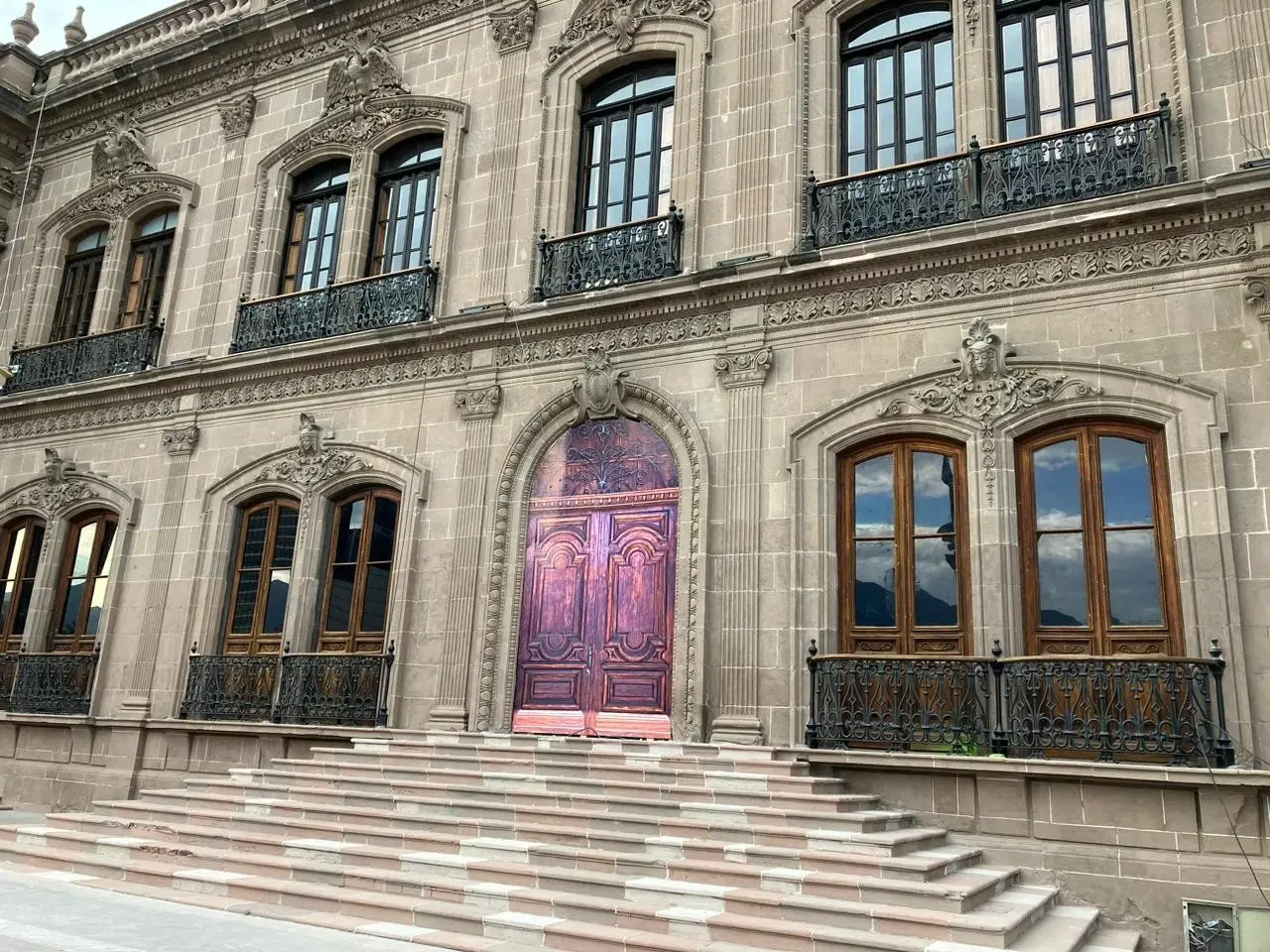 MONTERREY, Nuevo León.- Con unas calcomanías que simulan las antiguas puertas del Palacio de Gobierno, así es como lucen algunas entradas del recinto.