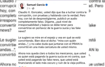 'Claudio X. González, usted dijo que iba a luchar contra la corrupción, con pruebas y hablando con la verdad. Pero hoy, con tal de desprestigiarme, publicó un audio completamente falso', escribió García.