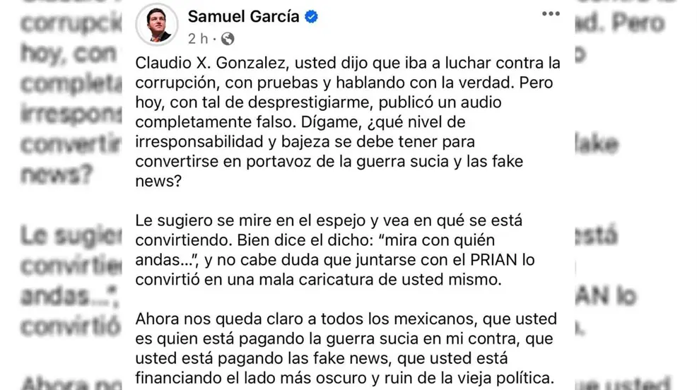 El ex presidente Vicente Fox y el empresario Claudio X. González difundieron un audio falso que se le atribuye a Samuel García, el audio corresponde a notas de voz viralizadas en 2018.