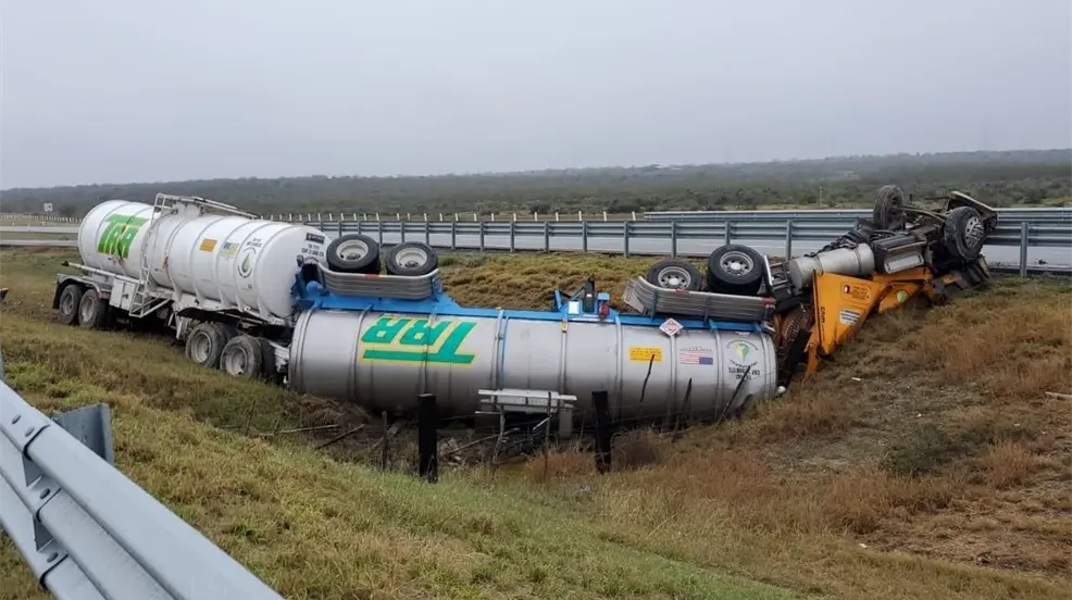 El incidente ocurrió en la Autopista a Reynosa, específicamente en el kilómetro 155, cuando el autotanque salió del camino y terminó volcado sobre el camellón central.