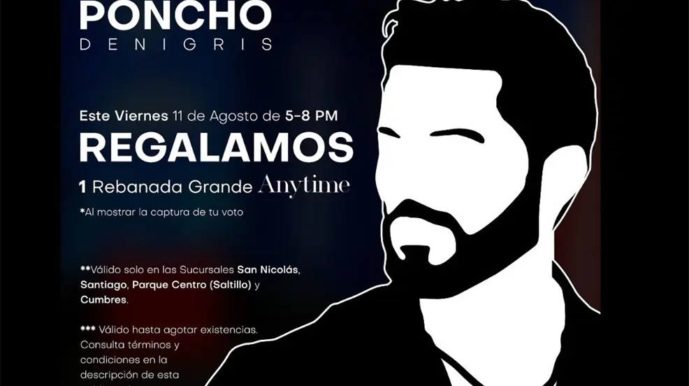 La promoción se hará el próximo 11 de agosto y consta de recibir una rebanada de pastel gratis, lo único que tienen que hacer los participantes es acudir a alguna de las sucursales participantes y mostrar un screenshot de que votaron por Poncho De Nigris para que gane en La Casa de los Famosos, esto en un horario de 5 de la tarde a 8 de la noche o durante las galas, pre galas y post galas del programa.