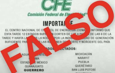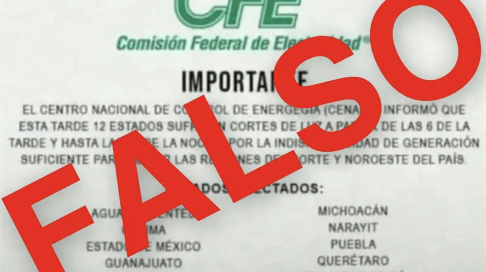 MÉXICO.- La Comisión Federal de Electricidad (CFE) emitió una alerta por la difusión de noticias falsas (Fake News) sobre supuestos apagones programados en diversos estados del país.