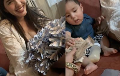 José Arizmendi sorprende a su esposa con un enorme ramo de billetes de 500 pesos.