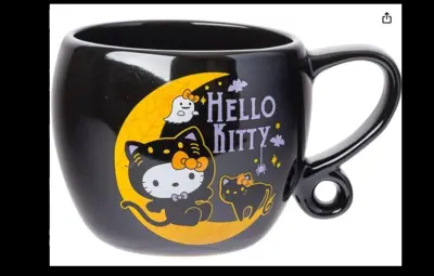 La taza presenta a la famosa gatita Hello Kitty en un disfraz de gato negro, sentada en una luna creciente contra un fondo oscuro. Este diseño es ideal para celebrar la temporada de Halloween y añadir un toque único a cualquier colección de productos de Sanrio.